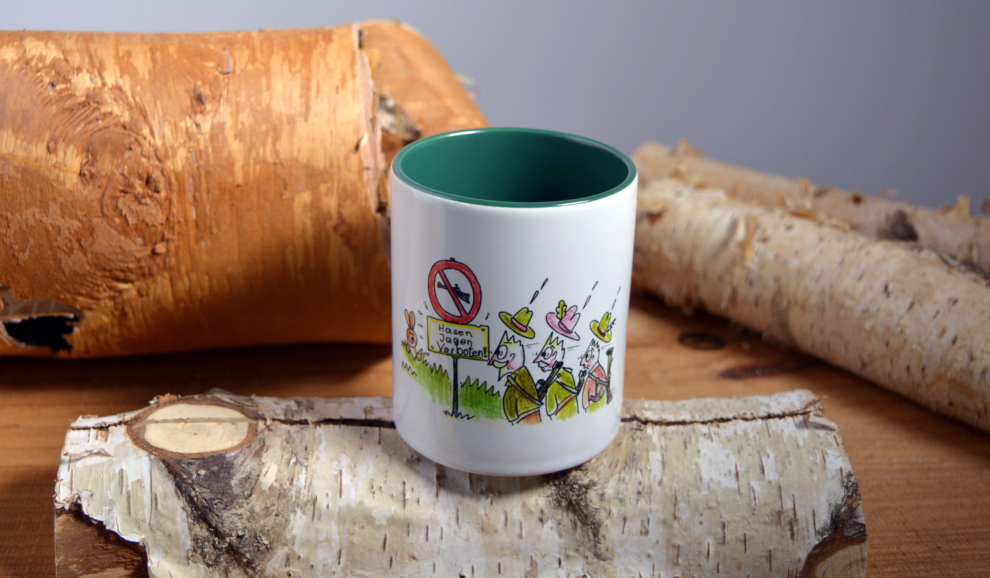 Ganz schön clever, dieser Hase... Das humorvolle Motiv entstammt der Feder unseres jungen Künstlers, Jörn Skorsetz, der im Kawerk in der Mühlenstraße 38, in Kappeln sein Atelier hat. Der Becher ist ein ideales Geschenk für Jagdfreunde.