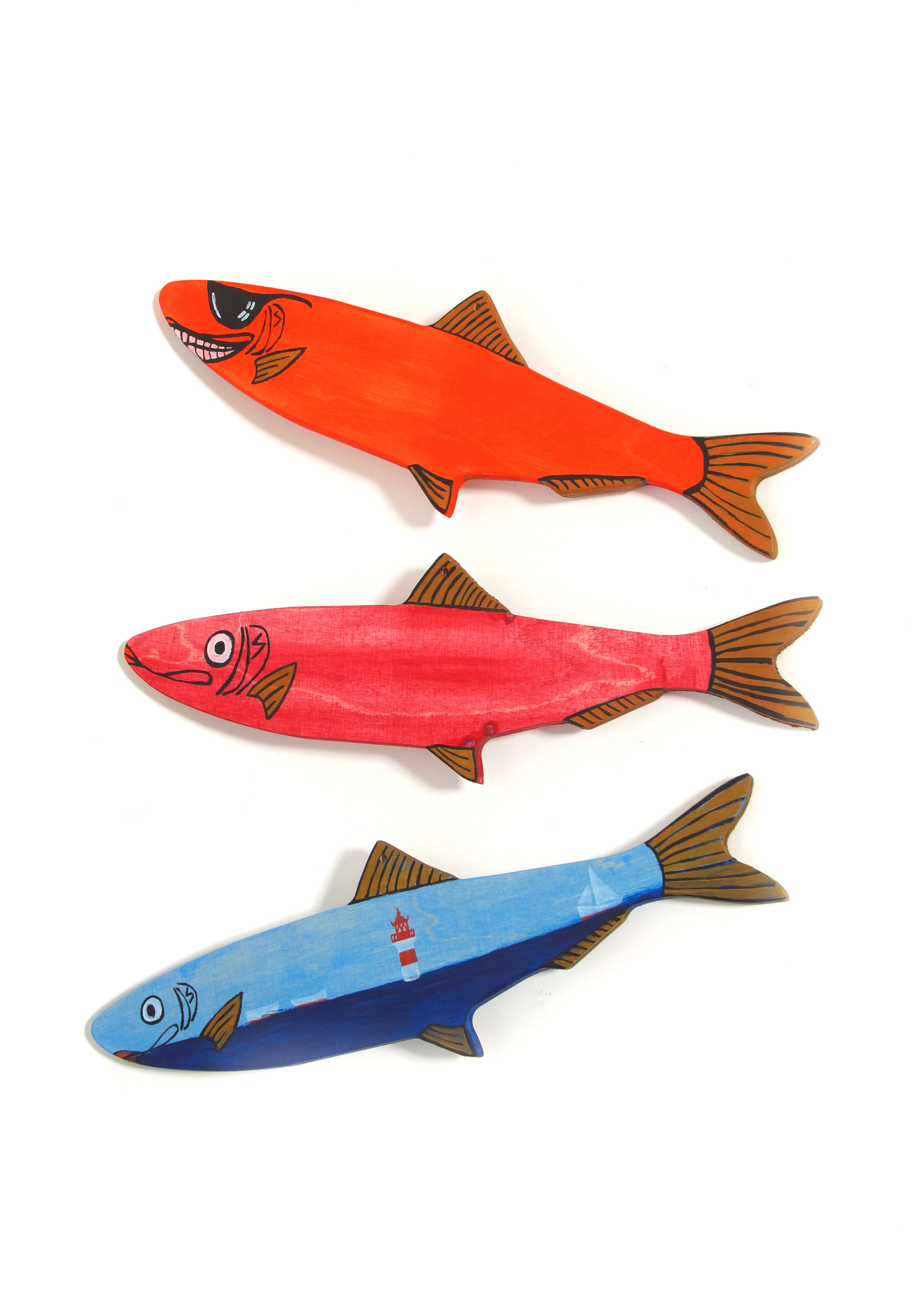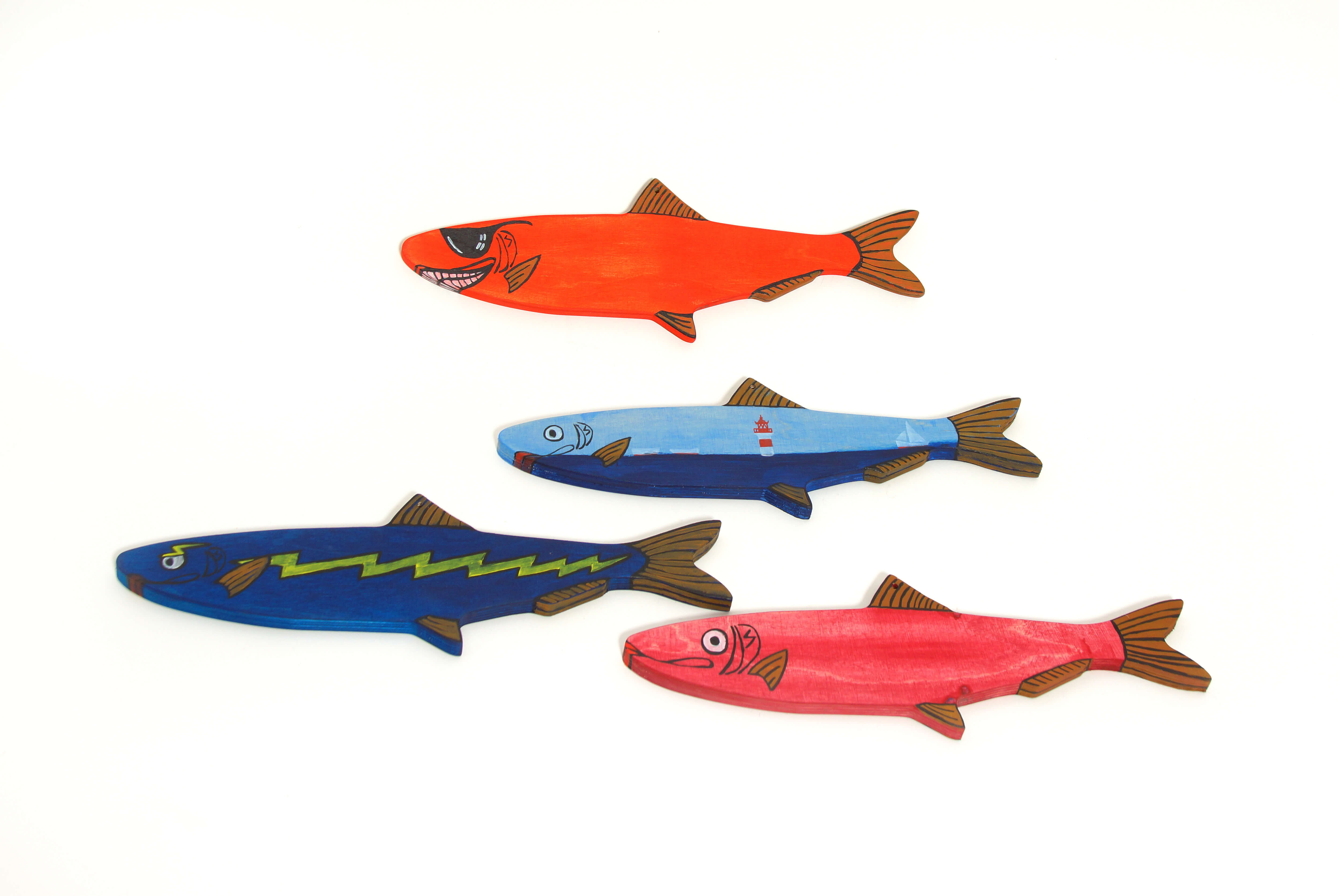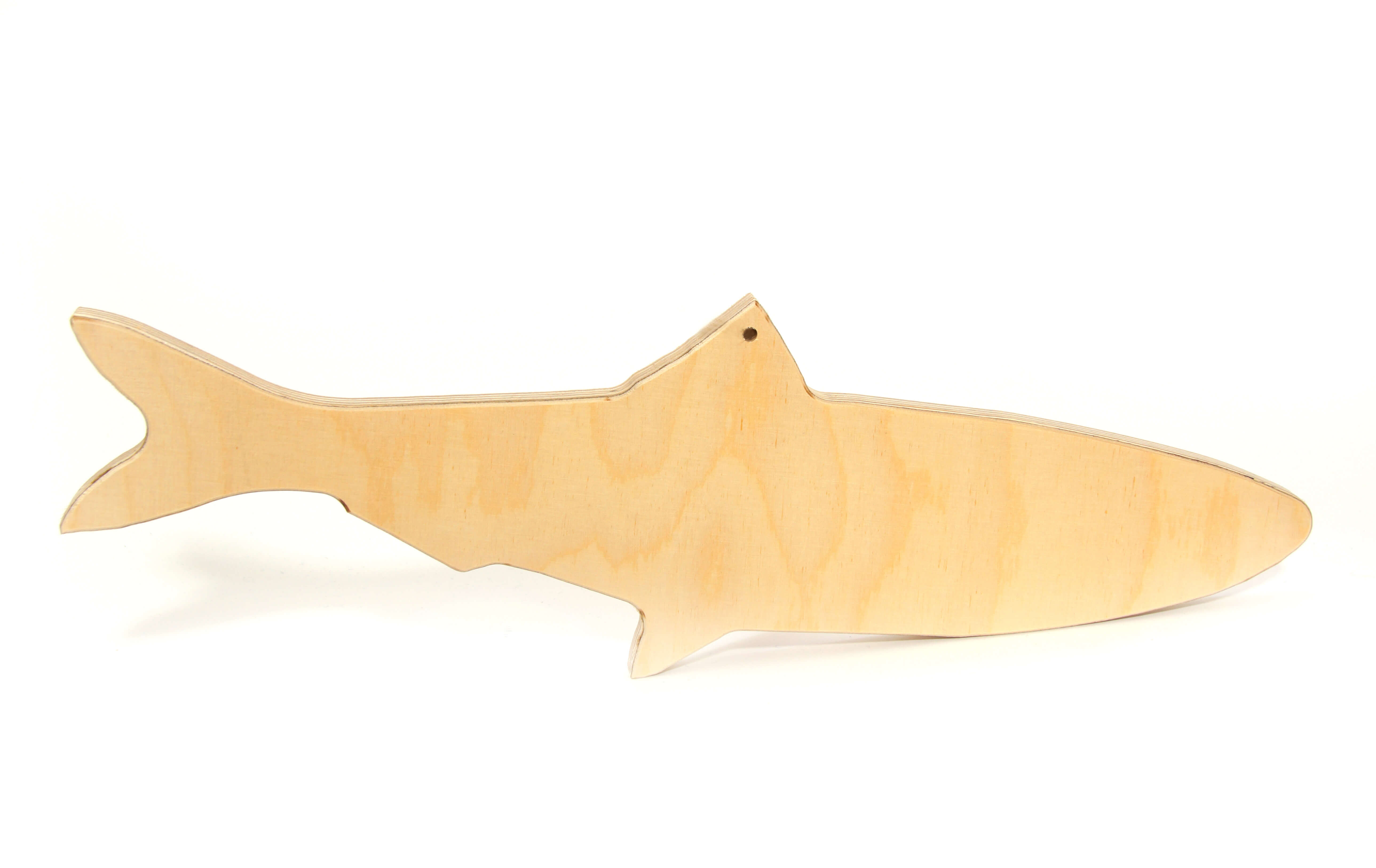 Die Holzfische sind mit zwei Löchern ausgestattet um sie entweder aufzuhängen oder auf einem Stab zu befestigen.